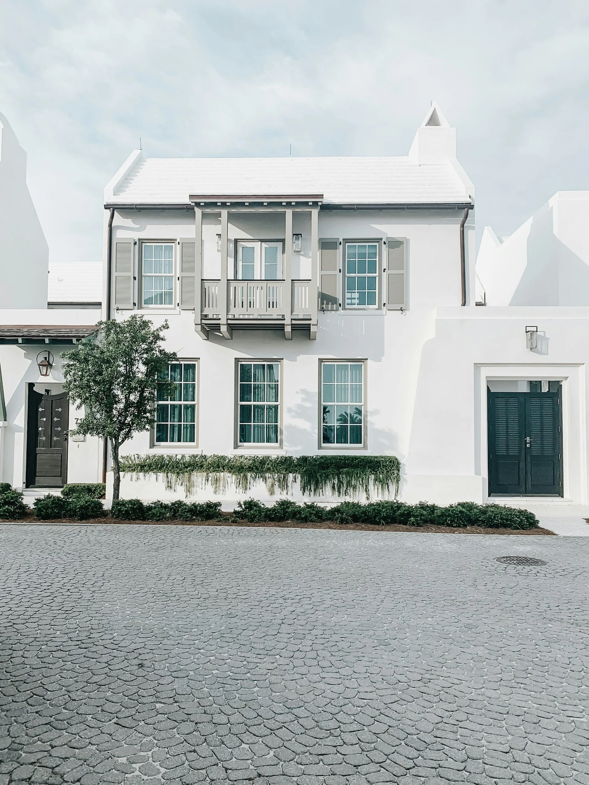 Photo Gallery A row of small stone cottages with steep sloped roofs, black window frames, and green doors, surrounded by greenery and wet pavement. White modern house with multiple windows, a balcony, and surrounding landscaping, paved driveway in front. Slide 1 Slide 1 (current slide) Slide 2 Slide 2 (current slide)